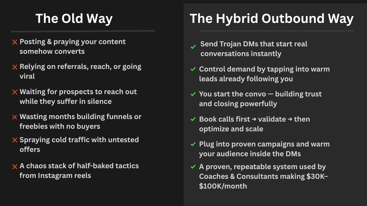 No ads. No funnels. No “going viral.” Just conversations → conversions.